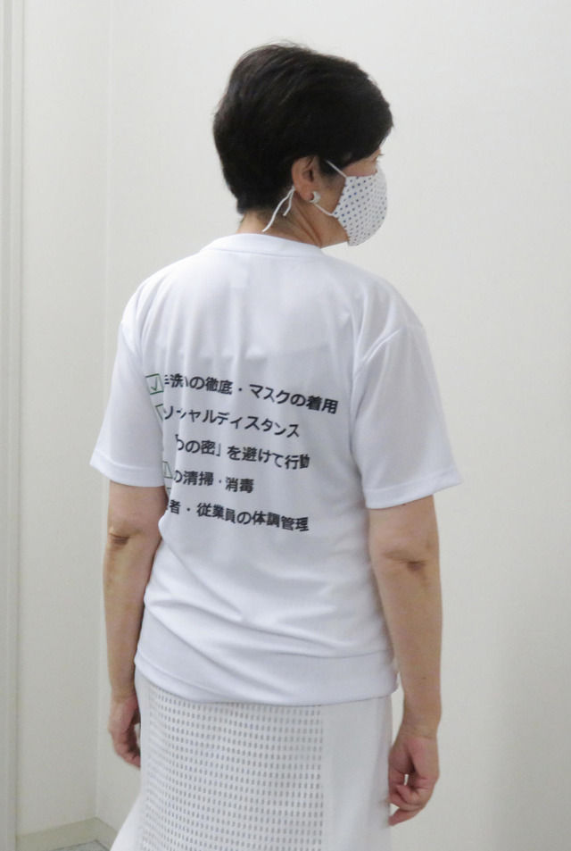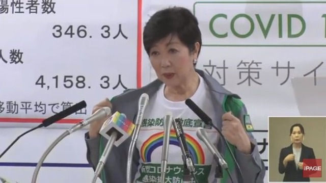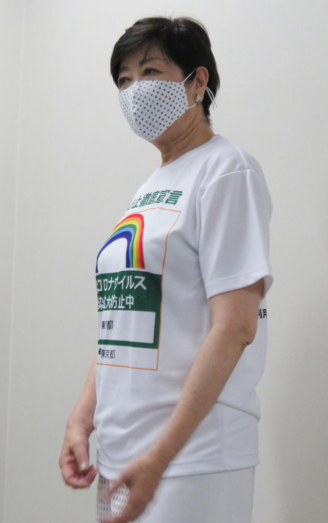 東京都の小池百合子知事が7日、感染防止徹底宣言ステッカーがプリントされたTシャツを着用し、定例会見に望んだ。